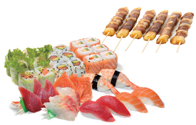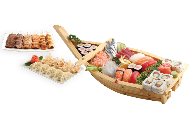 3 Sashimi thon, 3 sashimi saumon, 3 sashimi daurade, 6 spring roll, 6 saumon roll, 6 california saumon, 2 sushi saumon, 2 sushi thon, 2 sushi crevette, 6 brochette de boeuf fromage